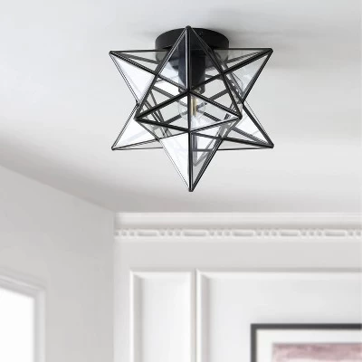 A European tradition dating back to the 19th century, Moravian stars like this one were displayed in windows during the days leading up to Christmas, but now have come to evoke a spirit of celebration year-round. Featuring an oil rubbed bronze finish and clear glass sides, this metal star flush mount is a dramatic addition to any living space. An eye-catching fixture, this pendant features an iron construction finished in bronze, framing clear glass panels to create its attention-grabbing star silhouette.