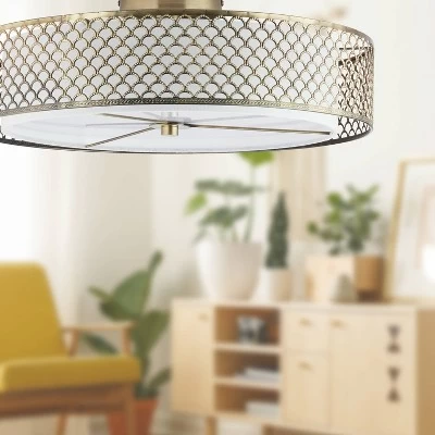 Bring glam style to your overhead lighting with this chic and unique Brushed Gold Metal Screen Ceiling Light from River of Goods. Designed in a shiny brushed gold finish for glam style, the metal canopy on this semi-flush mount ceiling light features allover clamshell-shaped cutouts for a touch of art deco flair. A white fabric shade underneath helps soften both the look and the light emitted from the two-bulb light kit. Great for placing above a sleek formal dining table, in your entry hallway or as a focal point in your living room, this metal and fabric ceiling light is sure to add instant style to your interior decor.