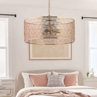 Add convenient overhead lighting while creating a stylish focal point in your home with the 24″ Giselle Polished Gold Drum Shade Chandelier Light from River of Goods. Designed with a sleek and shiny polished gold-toned canopy, hanging chain, fixture and shade, this stunning pendant light is a perfect choice for creating a dramatic lighting focal point above your dining room or for welcoming guests in an elegant entryway. The allover polished gold finish on the metal makes for an eye-catching look that complements a variety of color palettes, while allover punched-out designs in the drum-shaped metal shade form an art deco-inspired pattern while letting the three bulbs, not included, beautifully shine through.