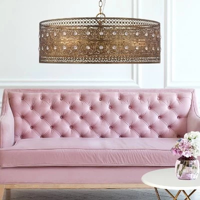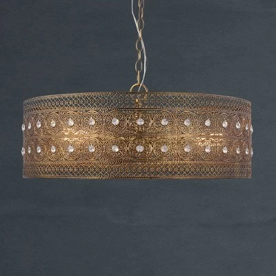 Bring some drama to accompany your dining table, living room or your home’s entryway with this stunning Glam Brass and Crystal 3-Light Chandelier Pendant from River of Goods. This hanging chandelier pendant features a drum-shaped shade in a shiny bronze finish, decorated all over with an ornate medallion pattern studded with faceted glass crystals for added sparkle. The light hardwires into your ceiling for a seamless look, and the gold-finish chain is height adjustable from 13.5 inches to 61.5 to find the perfect fit in your room. With a three-light design (requires E26 60-watt max. bulbs, not included), it’s great for adding a stunning centerpiece above your formal dining room table while bringing pleasant light to the room.