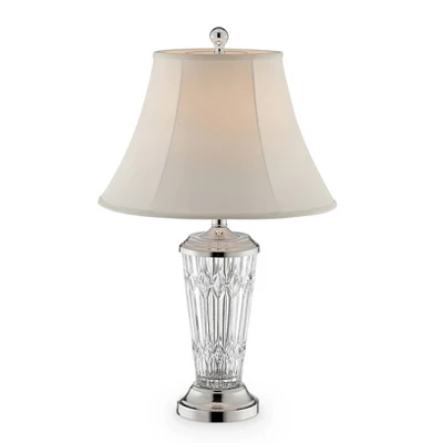 A set of two semi-fluted glass urn Portia Table Lamps with round metal bases and bell off white linen shades. Boasting elegance and modern style, this pair of transitional table lamps showcases bright clear glass as the focal point. Sleek metal bases offer an additional touch of shining appeal while matching clear chrome finials rest atop each lamp’s harp. The designs are completed with clean, classic off white drum shades. Perfect addition for your bedside, sofa table or office.