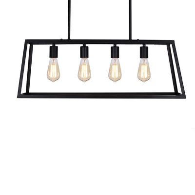 This industrial-inspired modern farmhouse pendant light features a durable and unique 30″ wide open metal cage in a timeless matte black finish that frames four (4) vintage-style LED light bulbs that are included. Hardwired, this fixture features a matching matte black rectangle-shaped ceiling canopy and two hanging rods, that are adjustable up to a maximum fixture height of 54.75″. Coordinates beautifully with modern, modern farmhouse, rustic, cottage, industrial, transitional, and loft-style home decor. Add a bold, vintage-inspired statement and ample illumination to a kitchen, dining room, living room, or entryway.