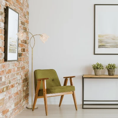 The 61″ H Meg Brushed Gold-Color Metal Candlestick Floor Lamp with Rattan Shades from River of Goods contributes the timeless, classic look of a cottage to your abode. This brushed-gold color candlestick floor lamp stands 67.5 inches tall and extends two arms to hold two white, bell-shaped rattan shades, adding a casual, relaxed vibe to a range of interior decor styles. The rattan shades’ open-weave design will create a glow when each of two 40-watt bulbs (not included) shine through. Use this light in your bedroom, your craft area, or in a kitchen or breakfast nook for the cozy, shabby-chic look you love.