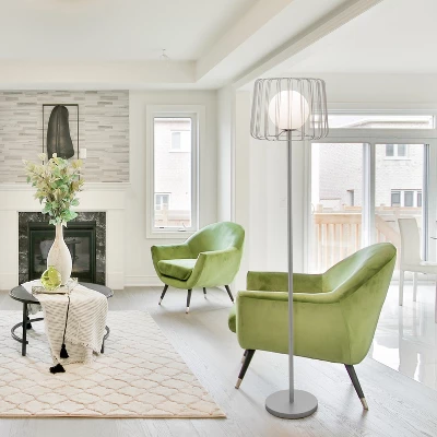 Amp up your decor with a standout industrial-style lighting option with this 62.75″ High Mateo Caged Globe Shade Floor Lamp from River of Goods. This unique floor lamp showcases a silver-finish metal candlestick base and a frosted white glass globe shade encased in a silver metal cage. The 90-inch cord with a foot switch allows for versatile placement in any room, and the lamp casts a soft, warm glow with one 8-watt E26 bulb (not included).