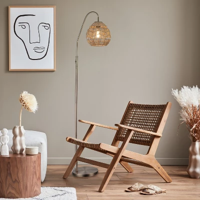 Perfect for your family room, game room or office, you’ll love this 63.5″ High Roswitha Brushed Gold-Colored Iron Floor Lamp with Tan Hemp Rope Shade from River of Goods. This brushed gold-colored iron floor lamp stands over 63 inches tall, and its glass-free shade features an artisanal look, thanks to its open-weave hemp rope construction. A 90-inch cord plugs in to power the lamp’s on/off switch, allowing for easy placement throughout the room. LED compatible, this lovely lamp requires one incandescent 60-watt E26 lightbulb (not included). A great accent for your Bohemian or beach-themed decor, this lamp also works well with modern and contemporary furnishings.