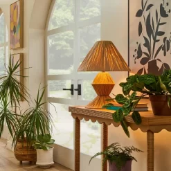 - Light from the tall table lamp’s bulb creates a stunning display as it reflects on the glass body