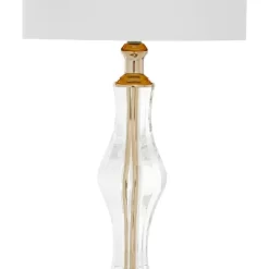 This glass table lamp’s square base allows it to rest on any nightstand or end table in your bedroom or living room. Designed with felt or rubber stoppers at the base that prevent scratching furniture and table tops, as well as sliding around. Requires 1 Type A E26/Medium (Standard) bulb. This item ships in 1 carton. Comes with a 65″ cord length. Easily place on side tables of bedrooms or living spaces. Suitable for indoor use only. Table lamp comes with a gray square shaped shade that measures 10 x 10 x 10 inches. Includes a on/off switch. This is a single table lamp. Glam style.