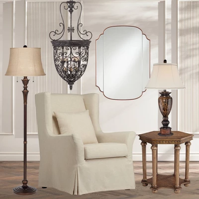 - Iron-look, scrolling foyer chandelier from the Franklin Iron Worksâ„¢ brand. 12 lights inside the open iron-look frame.