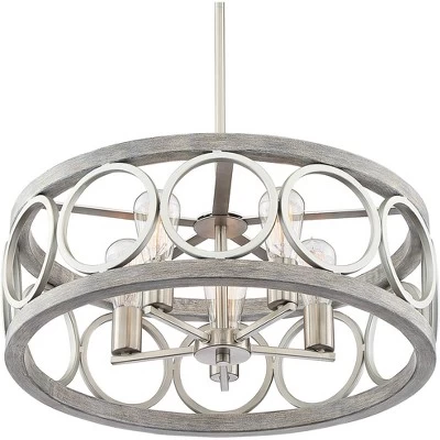 A gray wood finish outlines a brushed nickel openwork circle frame design. From the Salima collection by Franklin Iron Works, this beautiful contemporary five-light chandelier is an easy way to complement transitional style decorating or update more rustic decor. It also comes with five energy-efficient LED bulbs for extra convenience.