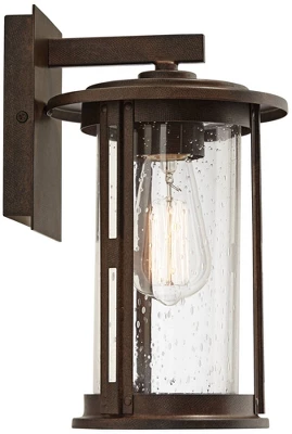 Inspired by Craftsman and industrial-workshop lighting, this outdoor wall light is a handsome addition to your home. It comes in a rustic bronze finish hanging lantern style frame, with a seedy clear glass cylinder shade inside. Vintage style Edison LED bulbs are recommended, providing the perfect match for this design.