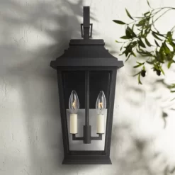 A traditional motif leans on bold design elements to create an expressive look in outdoor lighting. From the Warren collection by Generation Lighting, this two-light lantern outdoor wall light borrows from an Asian motif to produce a standout style. Textured black finish over stonestrong construction joins clear glass panels over a candelabra-style bulb mount. Choose this outdoor wall light to customize an exterior space.