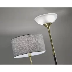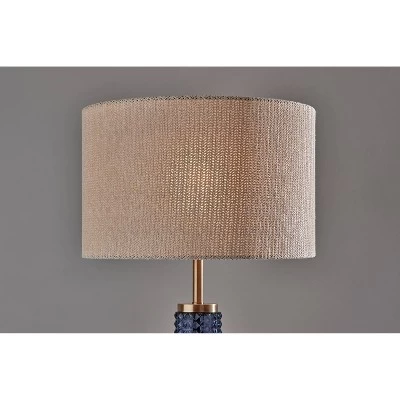 The 64.5″ tall Delilah floor lamp brings a warm, coastal touch to your home. With a long and slender stem in an antique brass finish that features a cylindrical blue textured glass accent piece, the lamp’s clean and simple style lines complement any décor. The stem leads to a sturdy, cylindrical base with an antique brass finish, while the floor lamp is topped by a drum shade made of woven light beige paper for a natural look. Operated by a 3-way switch and featuring a 150W bulb (not included), the lamp’s lighting level is easy to adjust between high, medium, low, and off, so you can always select the ideal lighting for your needs. Use individually to decorate your space or pair the lamp with the coordinating version featuring black metal and clear textured glass. Complete your home’s style with the coordinating Delilah table lamp.