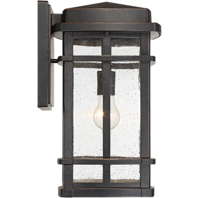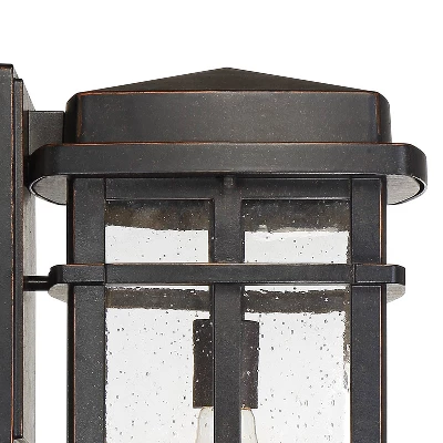 - Oil-rubbed bronze finish wallplate and lantern frame. Sturdy die-cast metal construction. Clear seeded glass panels allow the bulb to be seen.