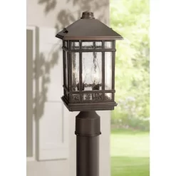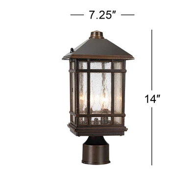 Get classic Americana styling with this outdoor post light from the the Sierra Craftsman collection by Kathy Ireland. It comes in a bold and handsome Arts and Crafts inspired design with clean lines and casual look. The rubbed bronze finish frame is done in sturdy die-cast metal and has decorative seeded glass panels for a decorative, rain-washed look. Pole not included.