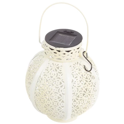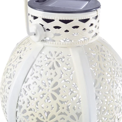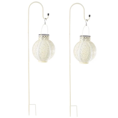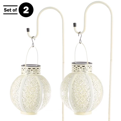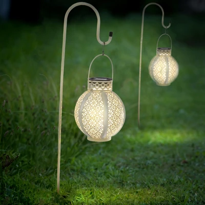 Add soft and subtle lighting to your backyard with the Solar Garden Lights by Pure Garden. This set of 2 lanterns are made of powder-coated iron with a white finish and gold inside for lasting use in your garden, backyard, porch, deck, or patio. The LED bulb in each hanging solar lantern is powered by a solar panel and rechargeable AAA battery and will automatically turn on at dusk. Once they’re switched on, the hanging lanterns provide 8 hours or more of soft lighting for parties, festivals, or gatherings with friends and family. This lantern set features hang rings and comes with 2 white shepherd hooks, so you can display these attractive lantern lights anywhere you want.