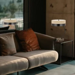 Cal Lighting’s Roanne Modern styled metal desk lamp is 22′ tall and features with 2 grounded power outlets and 2 USB charging ports. this lamp uses one 100 watt bulb (not included). The On / Off rocker switch is on the base. Hardback shade included. Brush Steel finish. This lamp will be a great addition to your office area, end table, or night stand. This lamp, with it’s shade, ships in one carton.