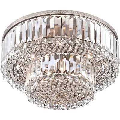 Add timeless elegance to your living space with this contemporary crystal ceiling light. The sparkling shade is made of glass crystal prisms and faceted rectangular accents, which throws the light around in a spectacular manner. A band of satin nickel finish metal adorns the top of the tiered flushmount design.